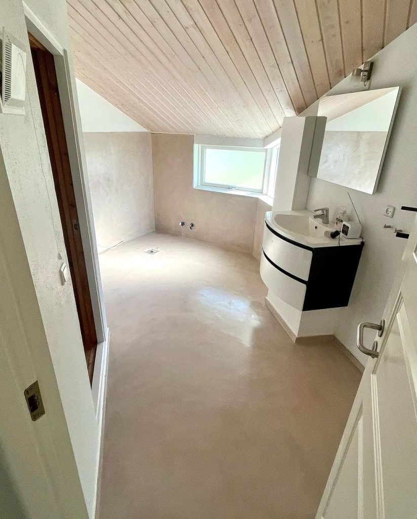 - Ikke godkendt til vådrum: Microcement er ikke i sig selv godkendt til vådrum. Der skal derfor først etableres en vådrumsmembran og fliser i brusenichen og andre våde områder, inden microcement kan lægges.